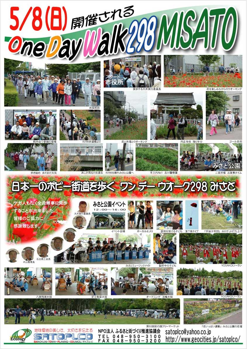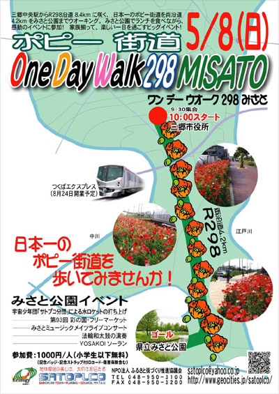 三郷中央からR298沿道8、4kmに咲く、日本一のポピー街道を両沿道4、2kmをみさと公園までウォーキング。みさと公園でランチを食べながら、感動のイベントに参加!家族揃って楽しい一日を過ごすビッグイベント!